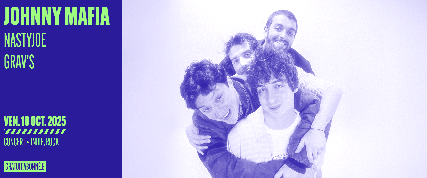 Entre indie rock et power pop US (qui rappelle Weezer à nos bons souvenirs), Johnny Mafia envoie une salve de riffs électriques et de refrains accrocheurs alliant ainsi rock furieux et sensibilité pop pour une expérience musicale unique. Préparez-vous à un live intense et inoubliable !